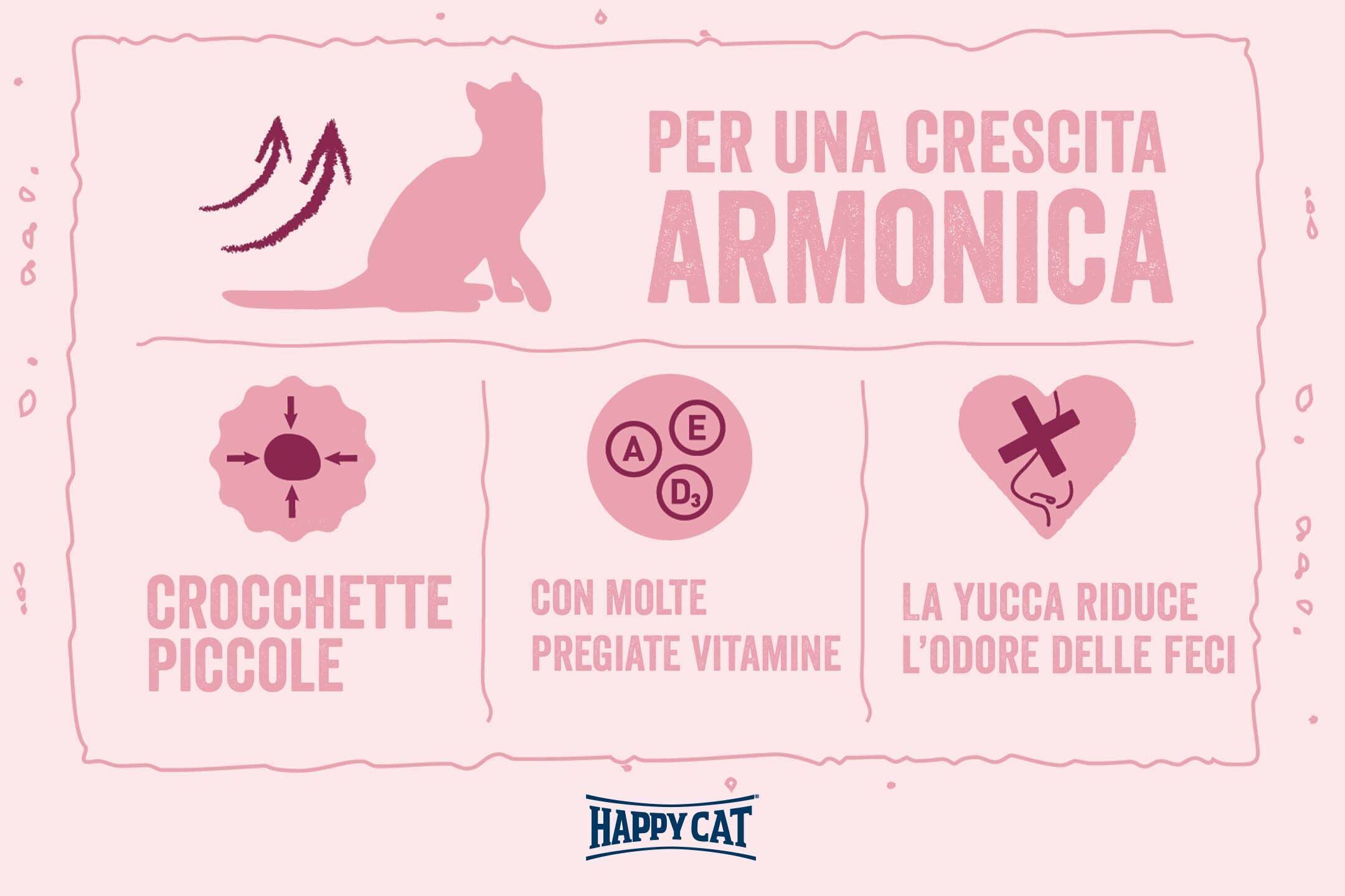 Lasciare sempre a disposizione dell’acqua fresca e pulita in una ciotola lontana da quella del cibo. Per via del fabbisogno individuale personale dei singoli gatti, la quantità indicata può essere aumentata o ridotta fino al 15%. Al raggiungimento del peso finale è opportuno modificare la dieta gradualmente, passando a un'alimentazione per adulti di Happy Cat.