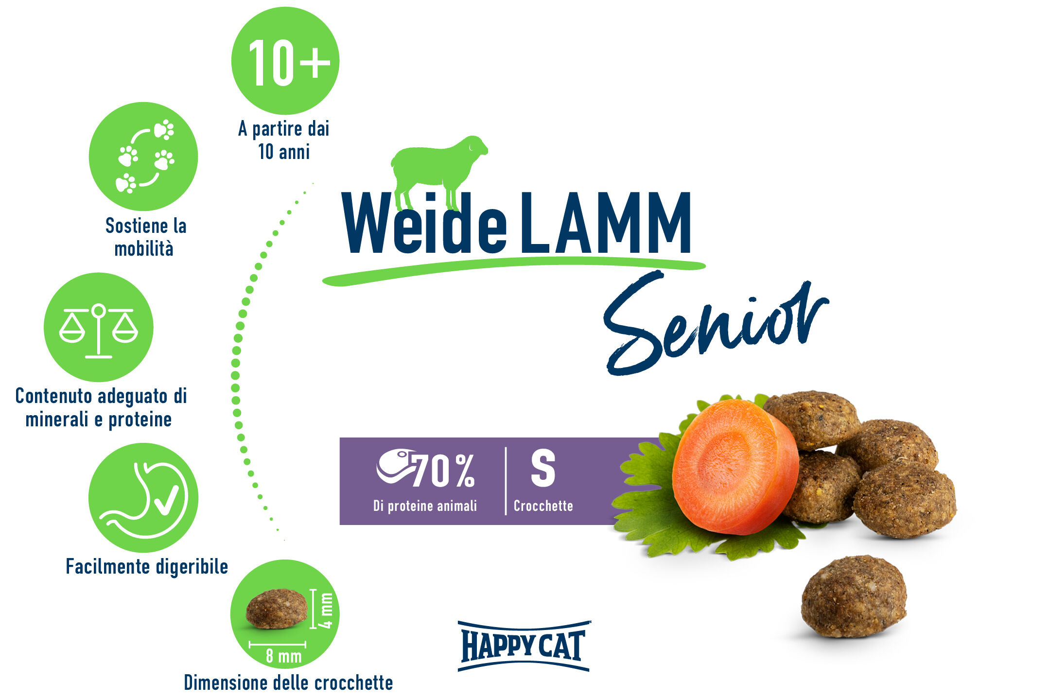 L'agnello è una fonte proteica particolarmente ben tollerata e facilmente digeribile, con molti minerali importanti. Questo rende Happy Cat Senior Pasture Lamb particolarmente adatto ai gatti sensibili. I gatti anziani si muovono meno o più lentamente e hanno quindi bisogno di meno energia, che devono consumare attraverso il cibo. Consigliamo quindi di passare a uno dei nostri alimenti per gatti senior dopo il compimento del 10° anno di età, in quanto soddisfa pienamente le esigenze dei gatti anziani. Per ulteriori informazioni sull'alimentazione dei gatti anziani, consultare la nostra guida ai gatti.