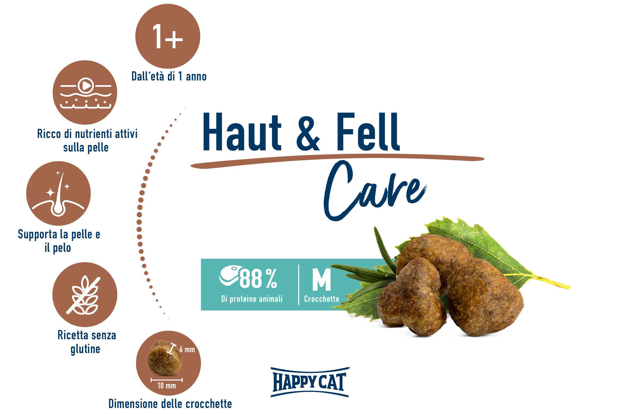 In alcune fasi può essere utile fornire alla pelle del vostro gatto nutrienti in grado di agire attivamente. Nei freddi mesi invernali, quando l'aria secca del riscaldamento danneggia il pelo del gatto, si raccomanda di alimentarlo con Happy Cat Care Skin & Coat. Quanto detto vale anche in primavera e in autunno, quando il gatto ha bisogno di molte sostanze nutritive attive per la pelle: vitamina A, vitamina B, biotina e zinco.